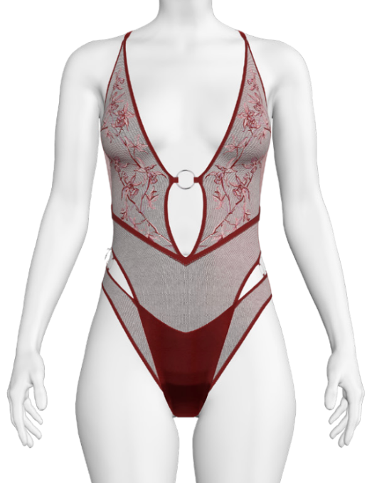 Sheer bodysuit designed to contour every curve; featuring custom nymphy T&S embroidered tulle, metal O ring hardware details, cutouts at hip and thong bottom.