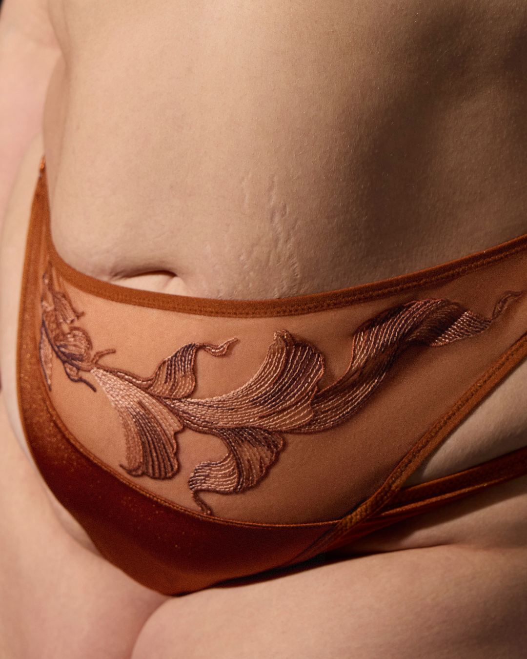 Custom T&S embroidered Thong with asymmetrical silhouette, strappy elastic and tulle/microfiber side panels.