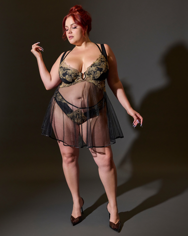Custom T&S embroidered metallic Babydoll with diamond wire at center front, microfiber cups with overlapping lace detailing and flowy tulle skirt.