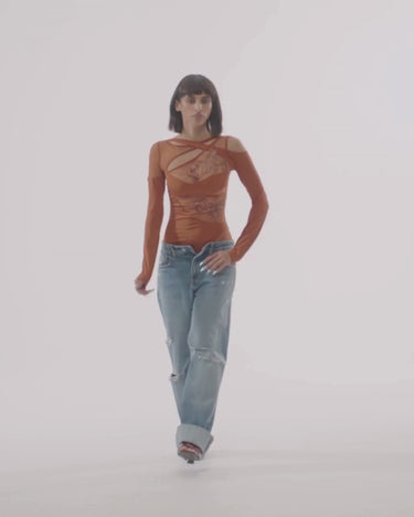 Custom T&S embroidered Bodysuit with asymmetrical long sleeves and cross body strappy neckline.