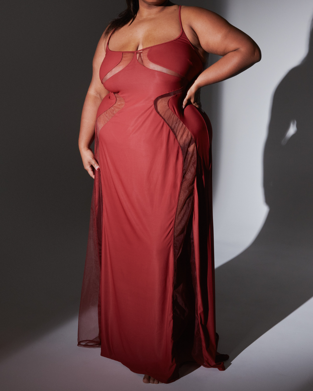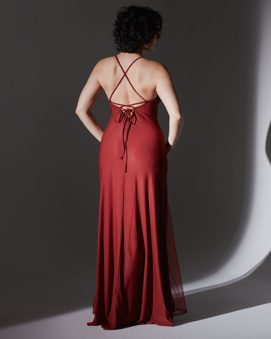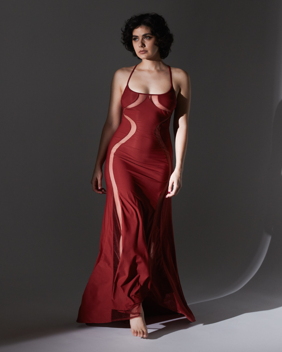 Dramatic floor-sweeping slip with serpentine color blocking and peek-a-boob cutouts. Features soft, shiny cupro jersey and ultra-sheer tulle, and the straps are crossed and tied together at the center-back, so you can adjust to fit your curves *just right*.