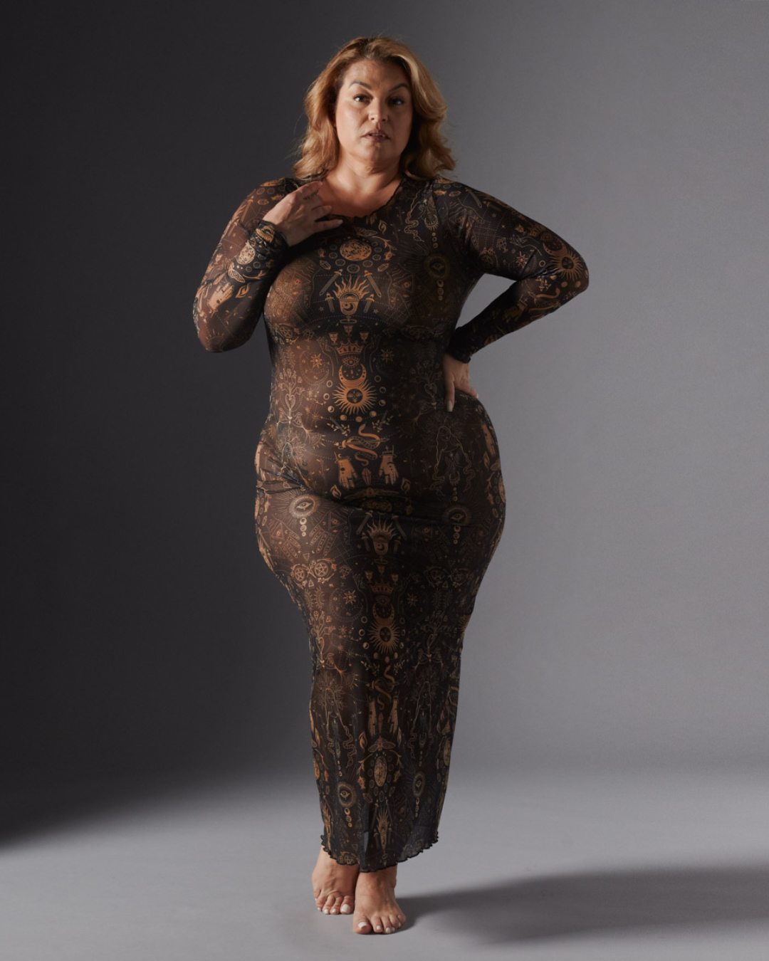 Mesh midi dress features a one of a kind Tarot inspired printed stretch mesh and purl hem. Pair with the Liquid Gold Kane Bra and Cut Out Thong for the perfect peek a boo moment on a night out or bare it all and lounge among the stars.