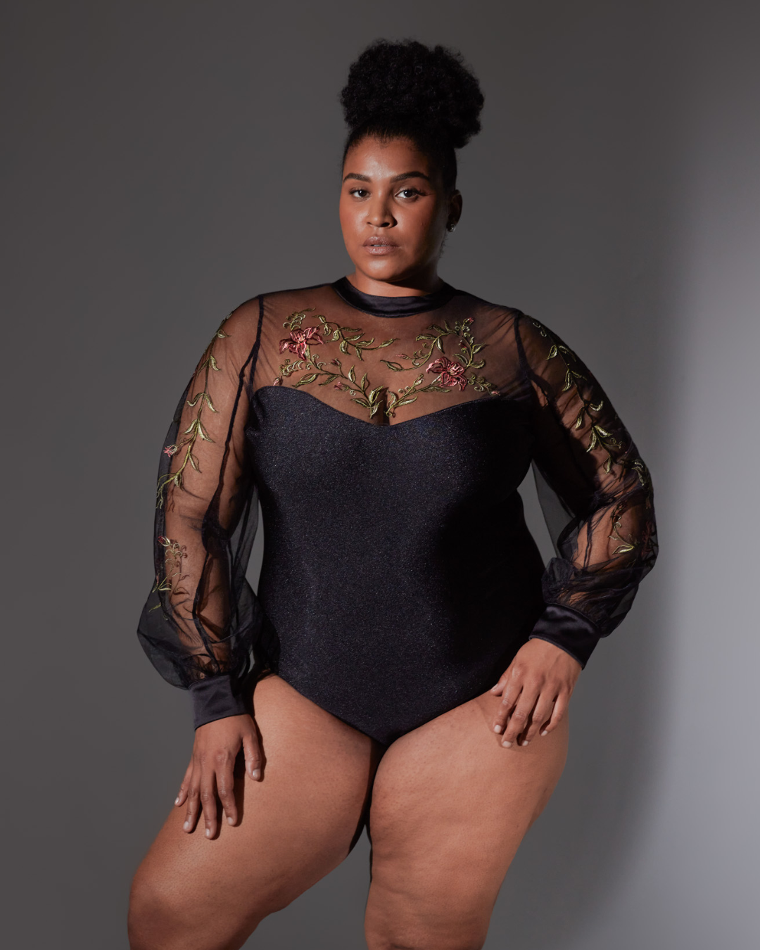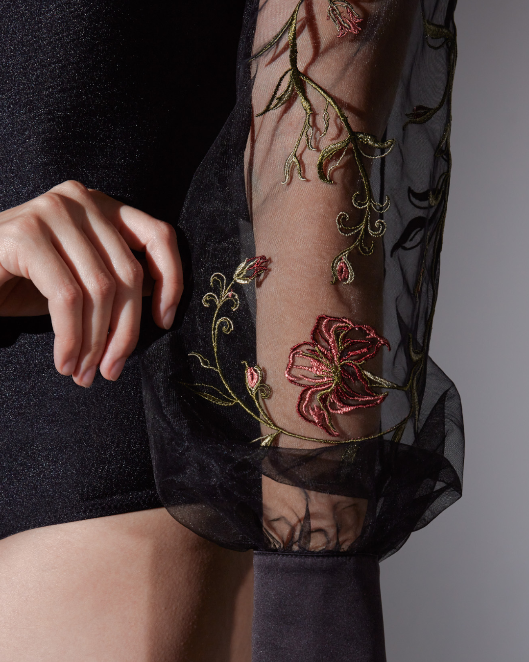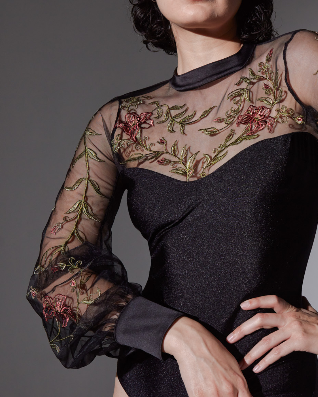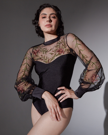 The Livia bodysuit features high neck embroidered tulle with lux center-back ribbon ties at your neck, billowed cuffed sleeves and snaps closure gusset opening.