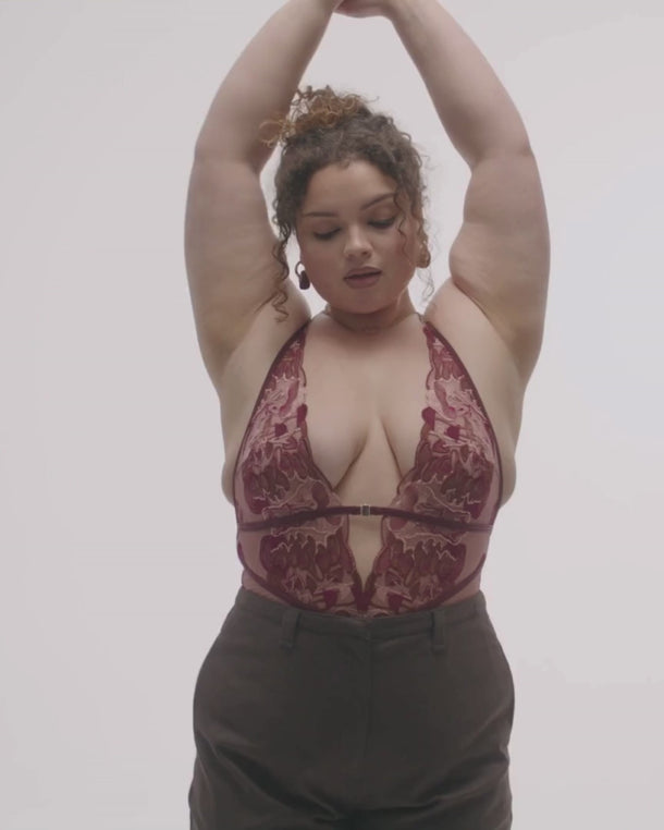 Lace bodysuit in custom T&S shrooms embroidery. Hand cut to flatter with microfiber and stretch mesh back. Criss-cross straps adjust at shoulder.