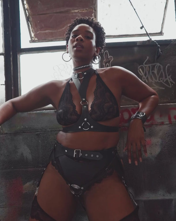 Can be worn as a harness alone or with the vegan leather and lace Heroine Thong.