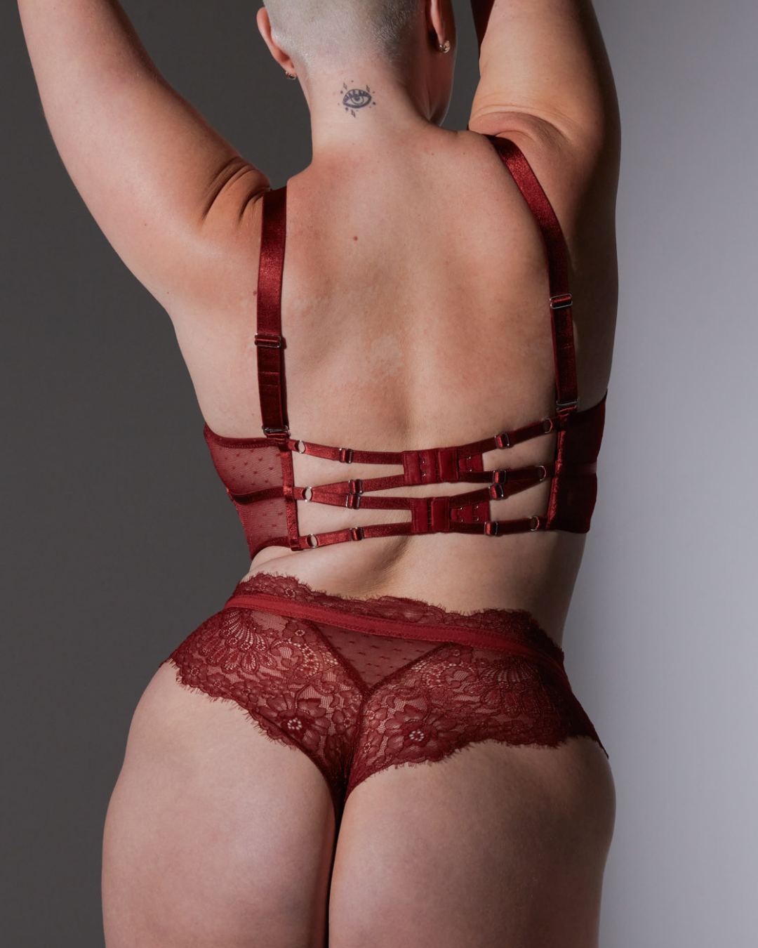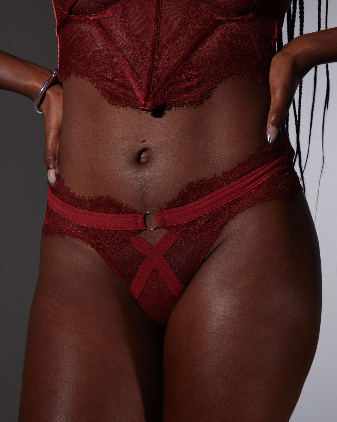 The beloved Minna Bodice, laced with curve framing structure, peek a boob detail, optional lace cap sleeves and matching Thong.