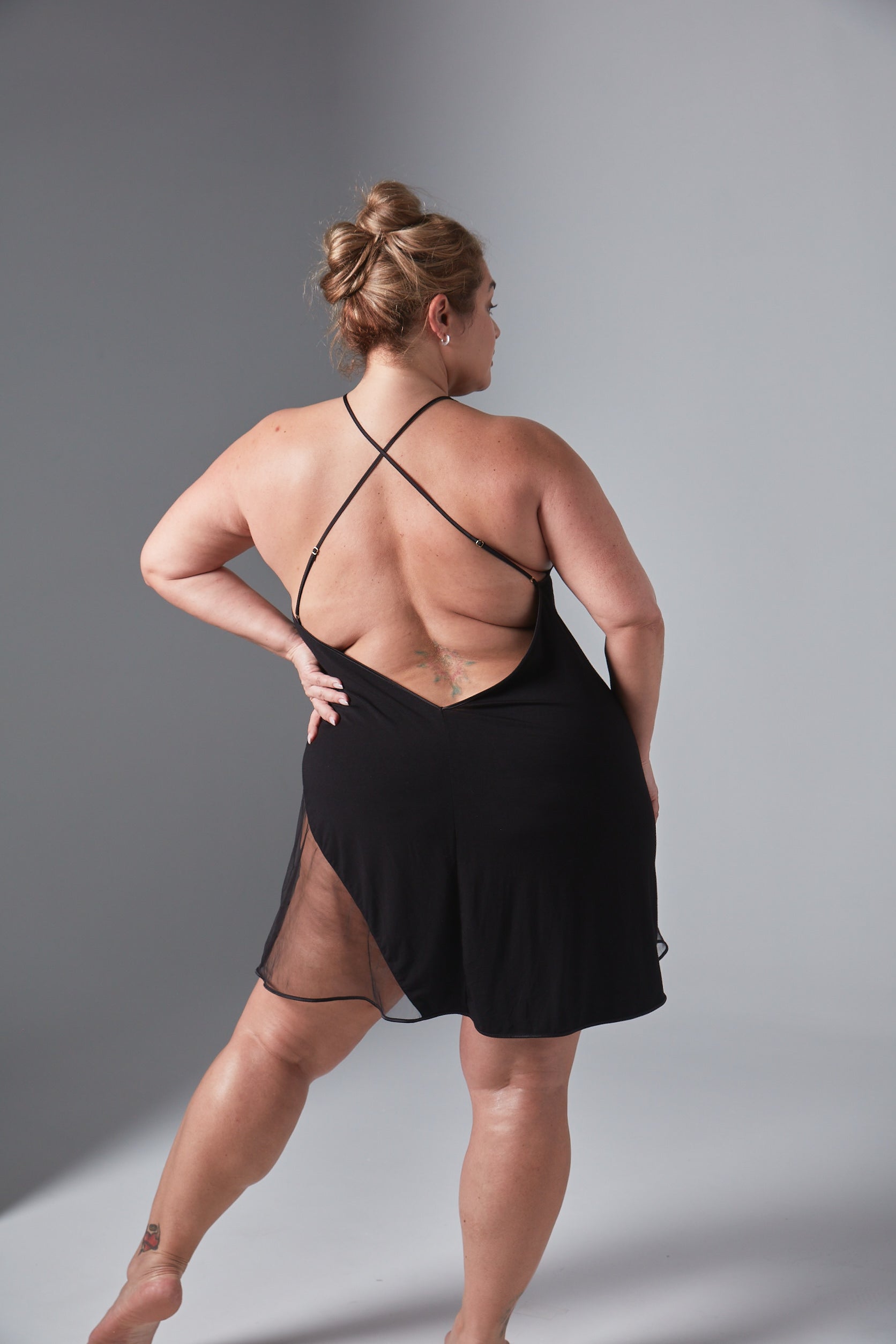 A line slip with adjustable cross back straps and sheer panels featuring custom Thistle and Spire embroidery.