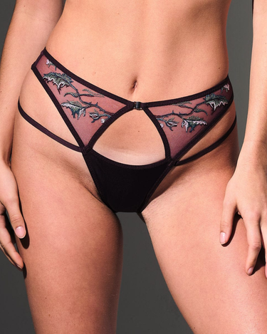 High-waisted thong with major cutouts and thigh strap details. Features a custom witchy, vintage T&S embroidery.