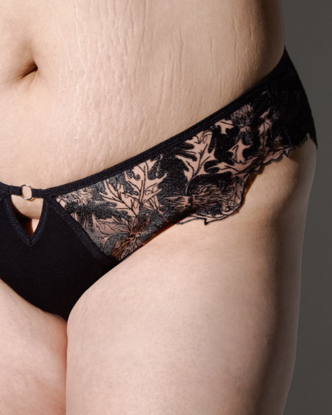Custom T&S embroidered tulle and lace panty with keyhole cutout at center front and O ring detail., with breathable cotton center front panel.