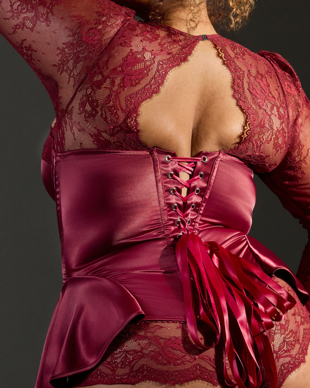 Luxurious lace and microfiber Corset with center front busk, sheer lace appliqué, seductive side flutters at hip, lace up back, and long lace sleeves.
