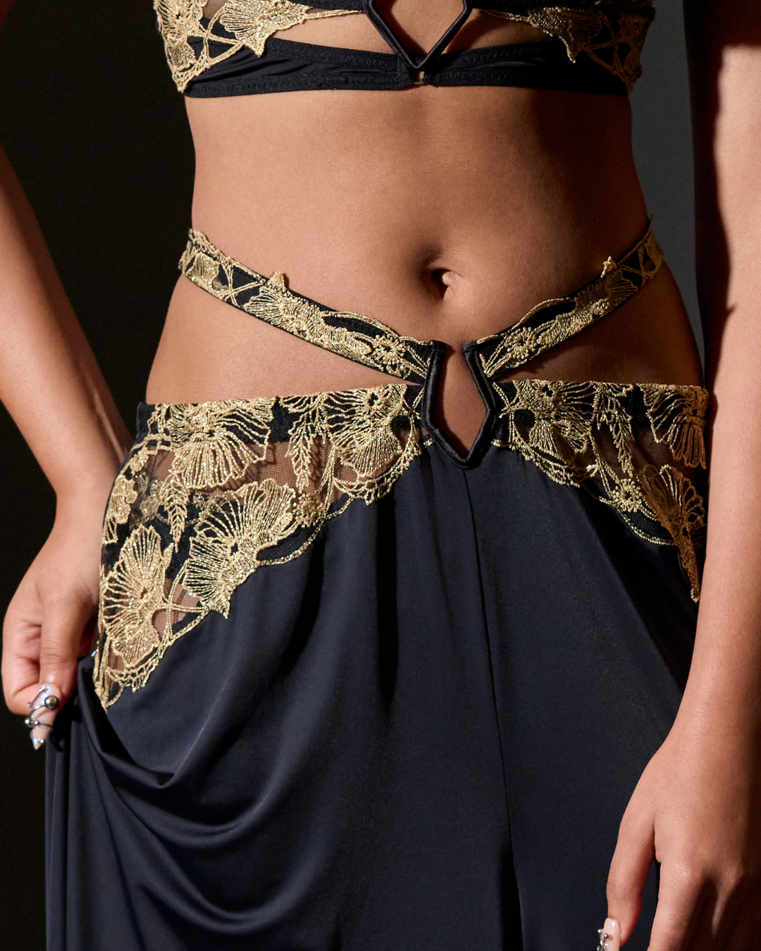 Custom T&S embroidered metallic pants appliqued onto luxe chiffon with diamond wire at center front and swan hook at center back.
