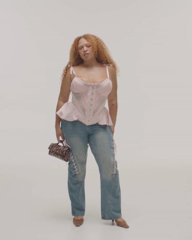 Sculptured 3-dimensional silhouette corset carved from a ruffled hipline and pleated bust with optional shoulder straps.