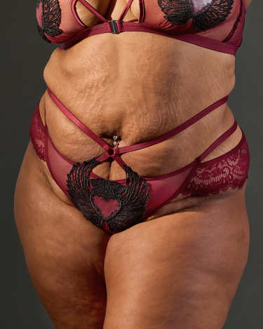 Mon Cœur Bikini features custom guipure appliqué with lace detail, adjustable waist straps and thong back.