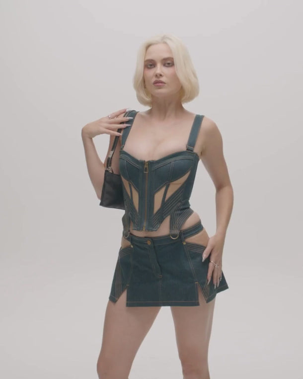 Denim mini Skirt featuring sheer tulle panels, contrast topstitching, front slits and traditional zipper and button closure at waistband.